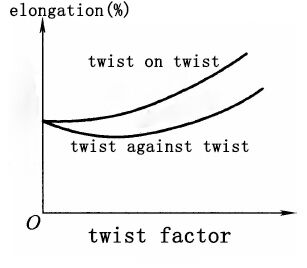 Katlanmış iplik ters yönde büküldüğünde, dış liflerin büküm genliği azaldığından uzama biraz azalır. Büküm faktörü arttıkça dış liflerin büküm genliği artmaya başlar, dolayısıyla uzama yeniden artmaya başlar. Katlı iplik aynı yönde büküldüğünde, liflerin ortalama büküm genliği büküm faktörüyle birlikte artar, dolayısıyla katlı ipliğin uzaması da artar ve katlı ipliğin ters yönde büküldüğü duruma göre sayısal olarak daha büyüktür, şu şekilde: aşağıdaki grafikte gösterilmiştir.